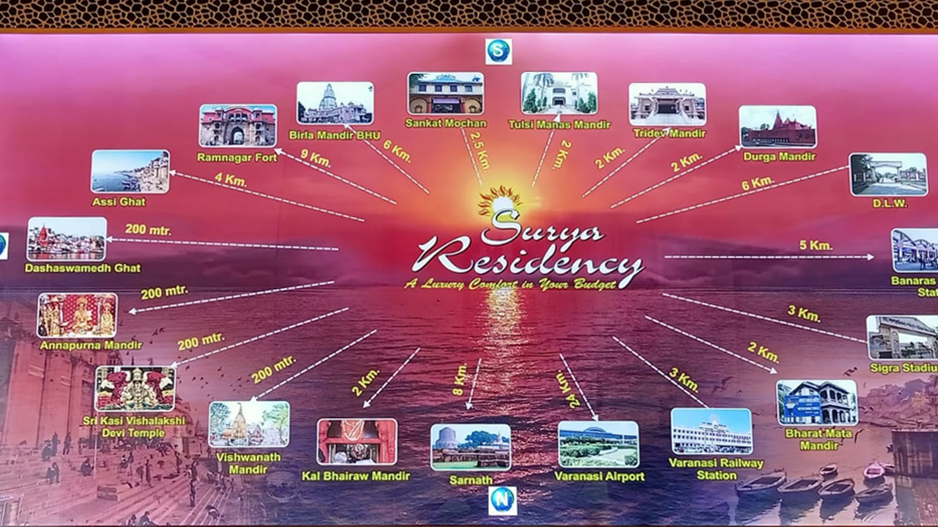 Hotel Surya Residency is located near HP petrol pump, Girjaghar Crossing at Varanasi. It is on the main road. No Problem for arriving. Dormitory AC/Non AC, Double Bed Room AC/Non AC & Triple Bed Room AC/Non AC are provided in budget rate. Customer feels homely atmosphere.